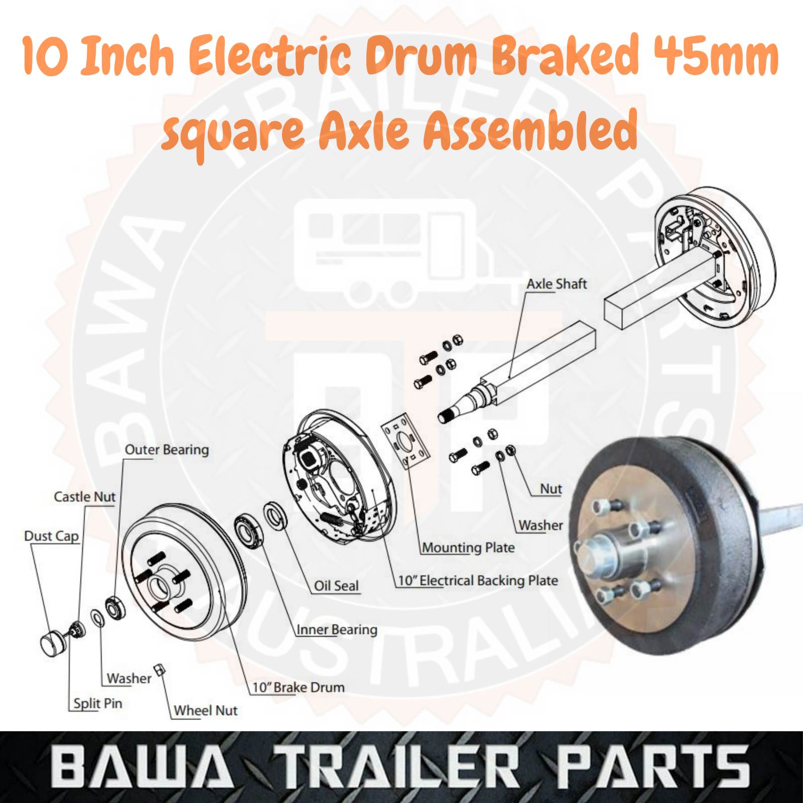 10 inch Electric Drum Braked 45mm square Axle Assembled! TRAILER PARTS