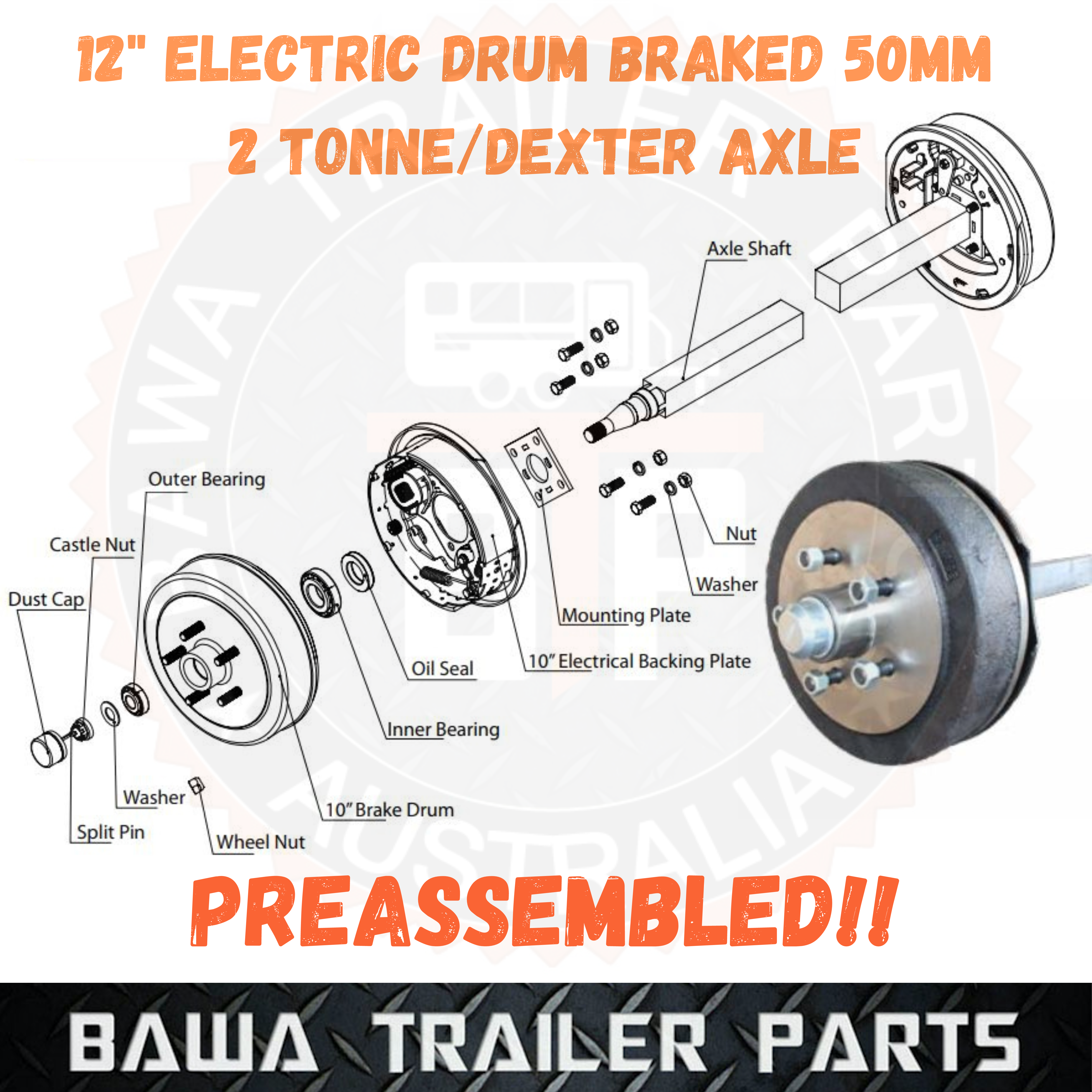 12″ 6 Stud Landcruiser Electric Drum Braked 50 Square 2TN Axle (1560mm HF to HF) – PREASSEMBLED AXLE