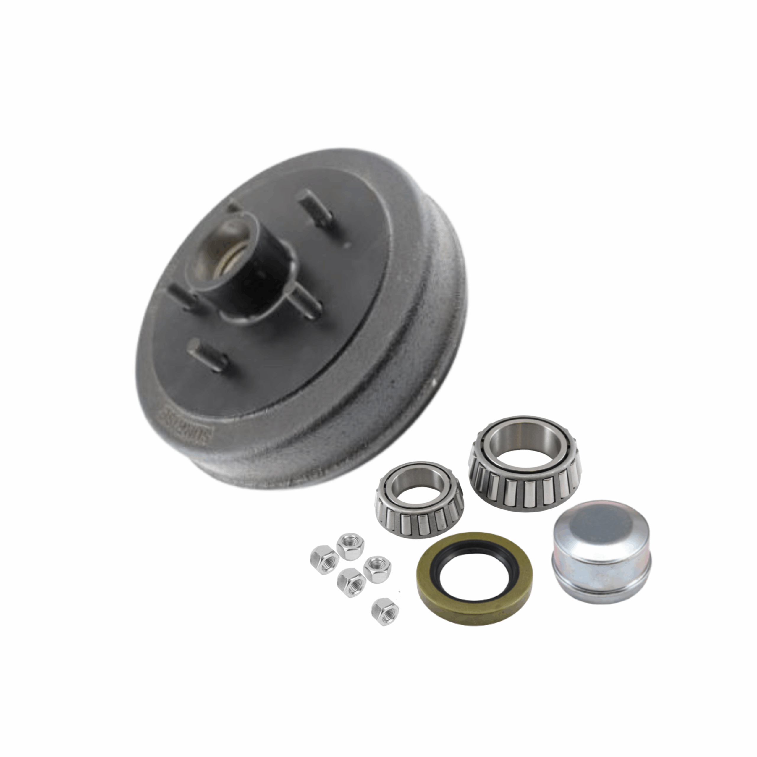 9″ Braked trailer drum with natural finish available in various different stud patterns and bearings.