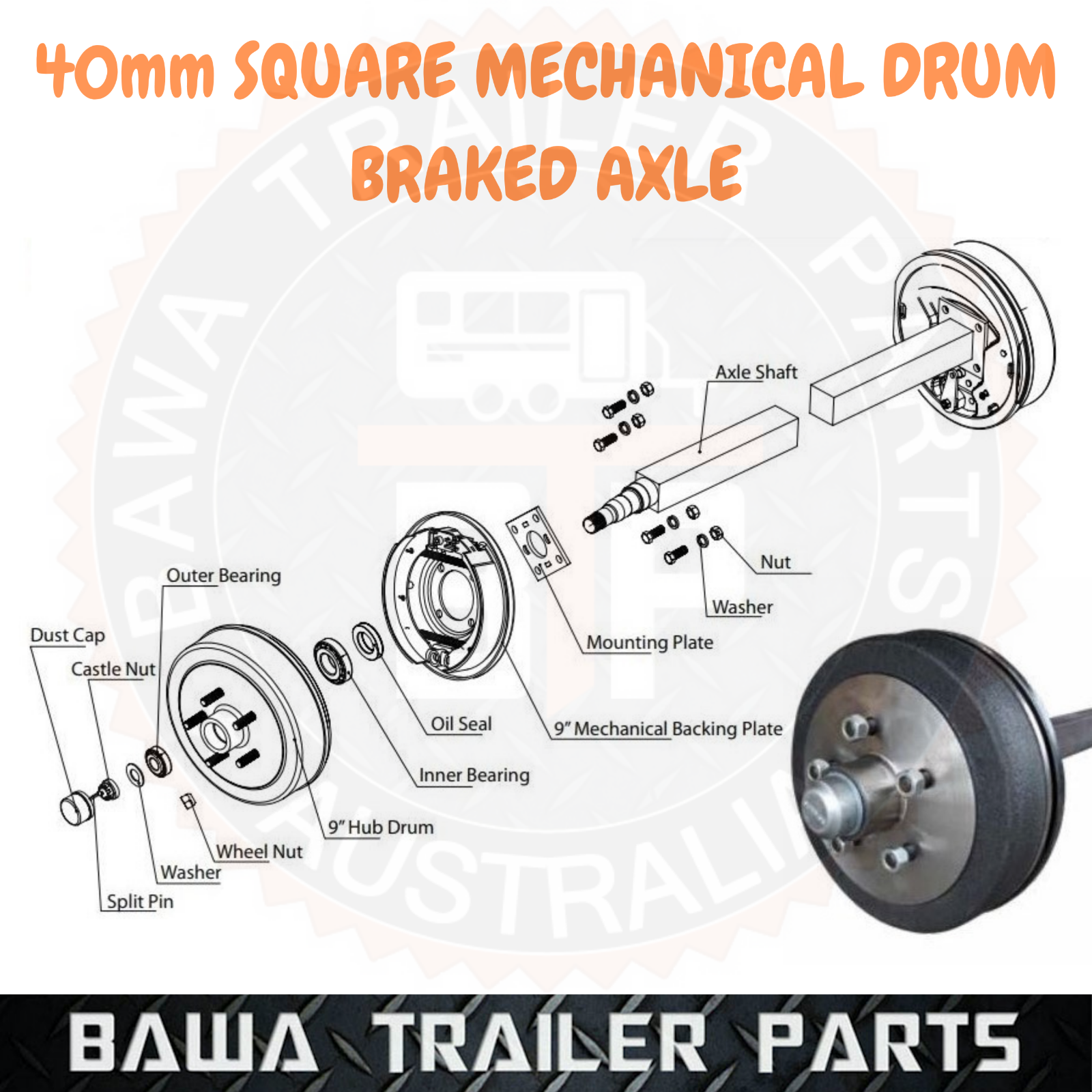 40mm Square AXLE ASSEMBLED WITH 9” Mechanical Drum BRAKES