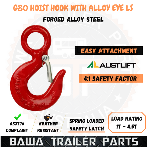 *Austlift LS type swivel self-locking hooks have a ball bearing swivel to allow the hook to swivel under load thus reducing the twist of a sling. Designed with enlarged eye for passing larger shackles without disassembly of the hook*