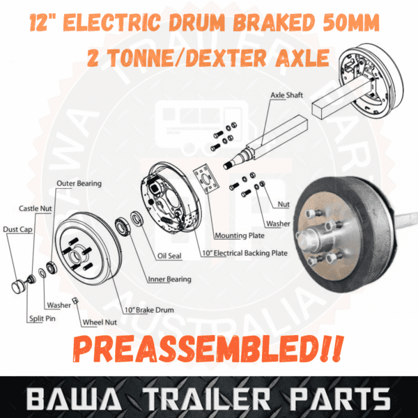 12″ 6 Stud Landcruiser Electric Drum Braked 50 Square 2TN Axle (2010mm HF to HF) – PREASSEMBLED AXLE